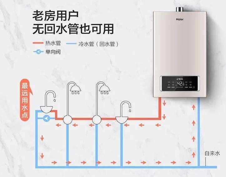 图解:这是家里没有回水管路时,安装零冷水热水器的实景图。这种安装方式的好处是:不需要预留回水管路,老房换新不需要砸墙,就能轻松实现开机零冷水。
