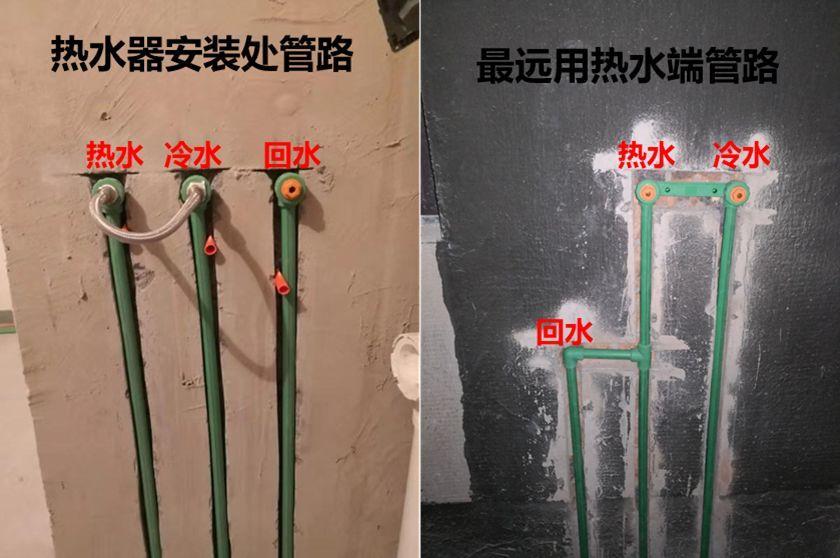 图解:这是使用零冷水燃气热水器,预埋回水管路安装实景图。冷水管正常安装,回水管并着热水管走一遭,在最远用水端汇合即可。