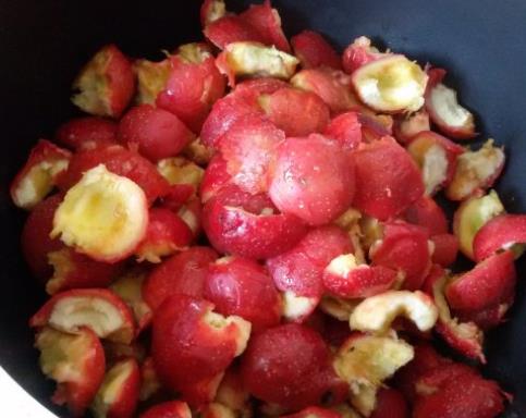 第三步,取出后,将山楂的核去掉,仅留下果肉;