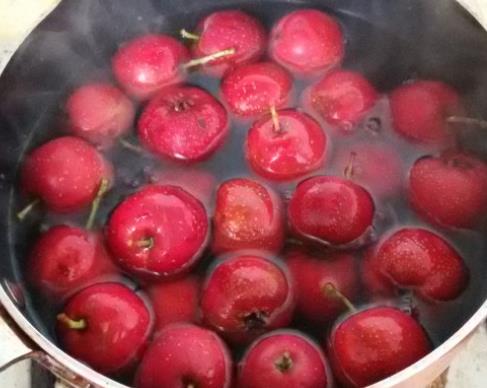 第二步,清洗干净的山楂放在锅中,加上没过山楂的水,烧开后,焯烫至可以轻易将山楂核取出来的状态,就可以盛出来了;