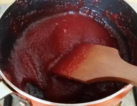 第六步,山楂果泥倒在锅中,加上准备好的糖,小火煮开,直至糖全部融化,在期间要不停地用铲子搅拌,煮至山楂泥变稠就可以了;