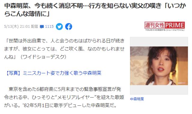 中森明菜父亲两年前经历丧女之痛,如今又和爱女失联,加之中森明菜曾患有抑郁症,有过自杀经历,这让老人家很担心,同时年逾87岁的他,大概也希望得到女儿的赡养和陪伴。