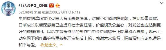 如今事情还没过去,PGone就把这首歌给下架了,用他自己的理由是早期接触嘻哈文化受黑人音乐影响深厚,对核心价值理解偏颇,在此郑重道歉。感觉跟阿娇的那句很傻很天真有异曲同工之妙啊