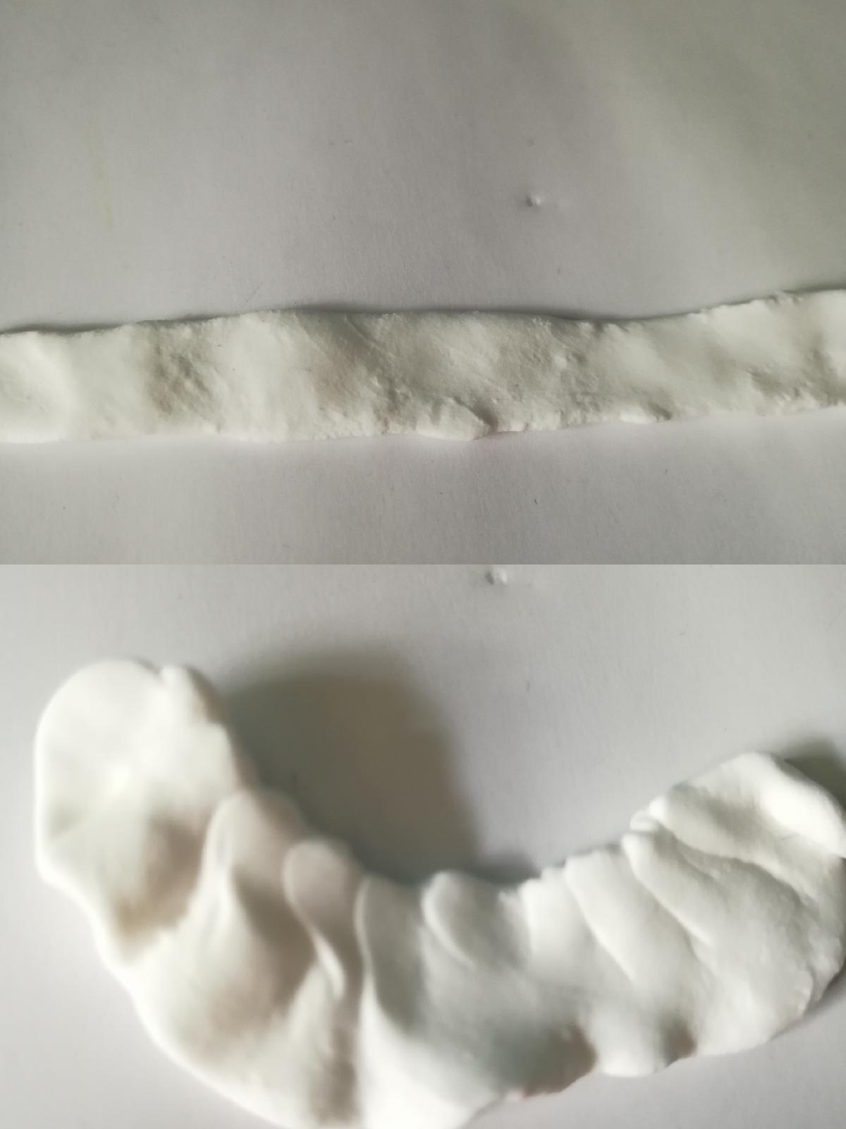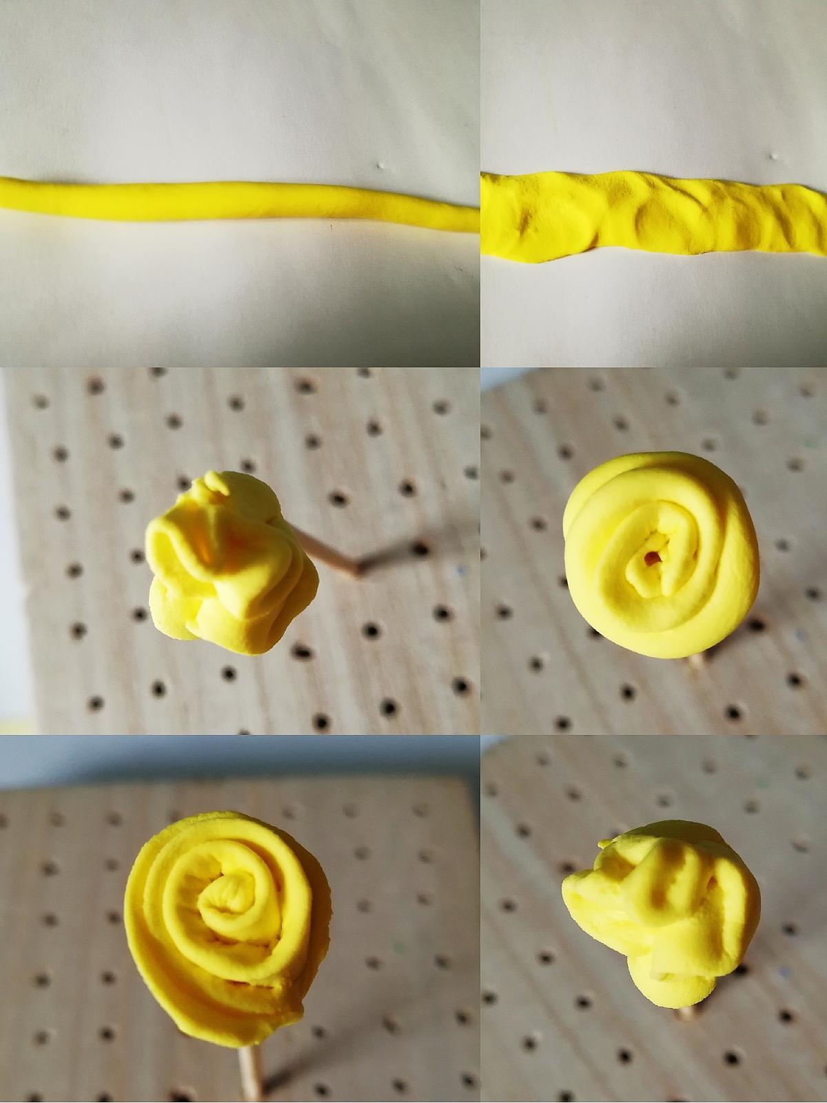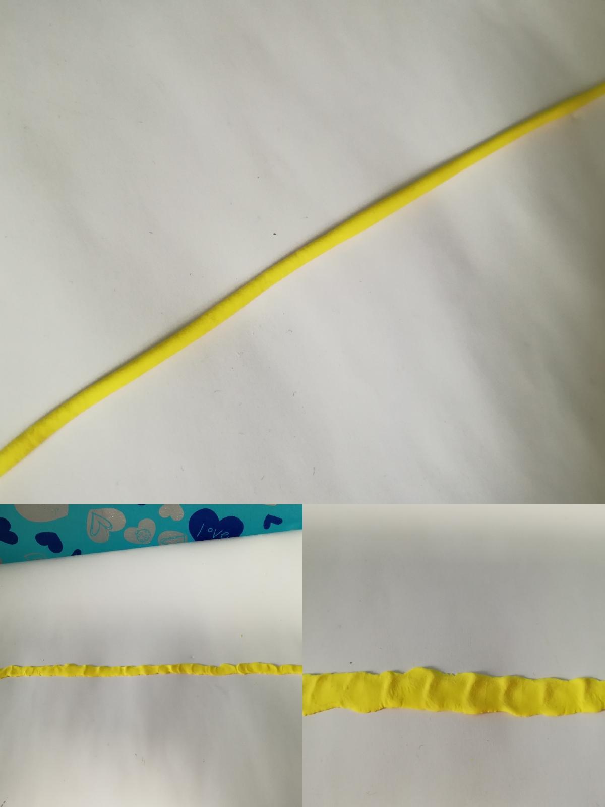 3.白色和黄色做蛋糕的花边!也是搓成长条后,用手指压扁后粘上。