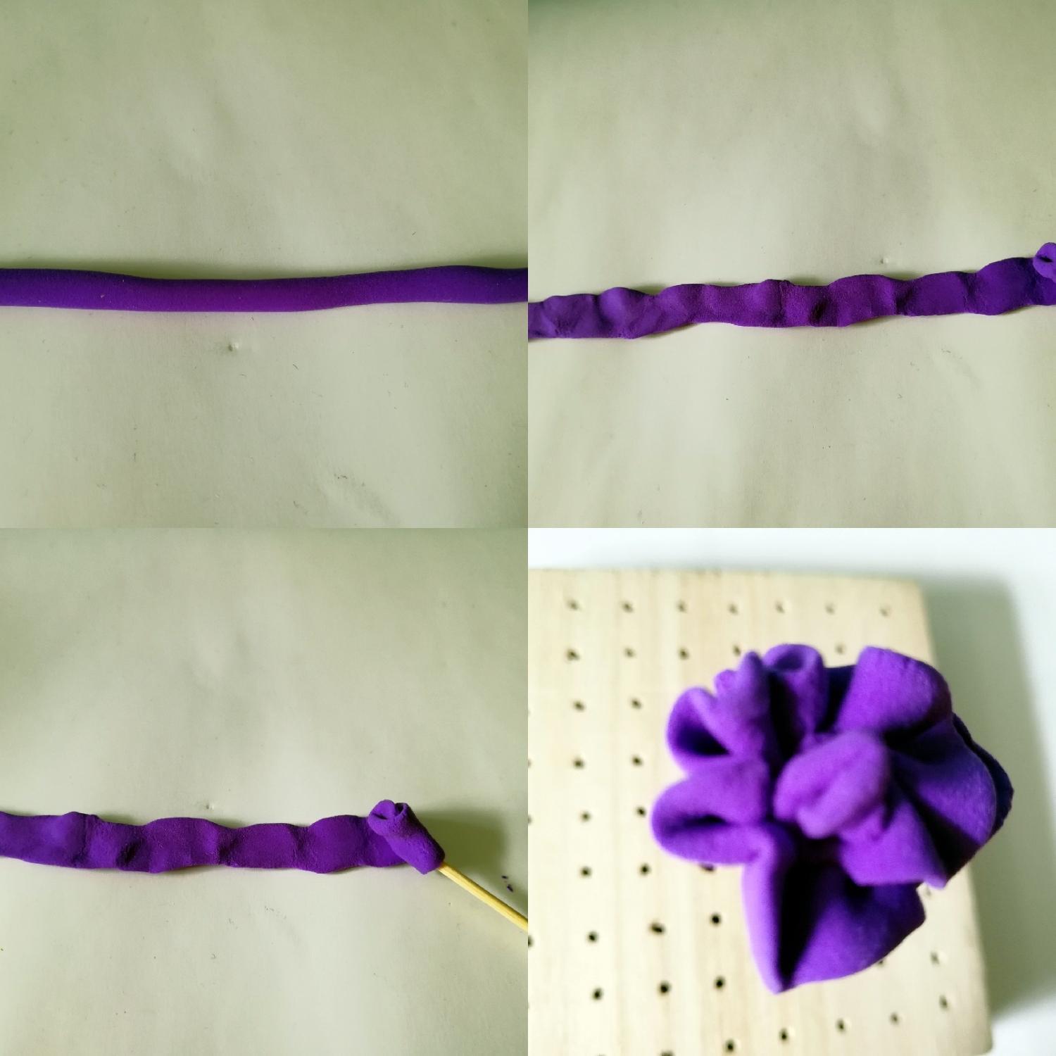 2.做很多朵紫色的花,搓成长条后,用手指压扁,再用牙签卷起,卷起是时留空隙。过程如图,粘在上面。