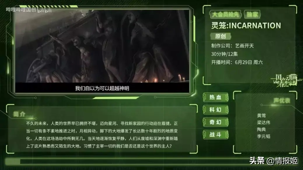 据哔哩哔哩国创今天下午的《bilibili2019国产动画春季导视》,备受关注的国漫《灵笼:INCARNATION》正式定档6月29日,共12集,每集时长30分钟。