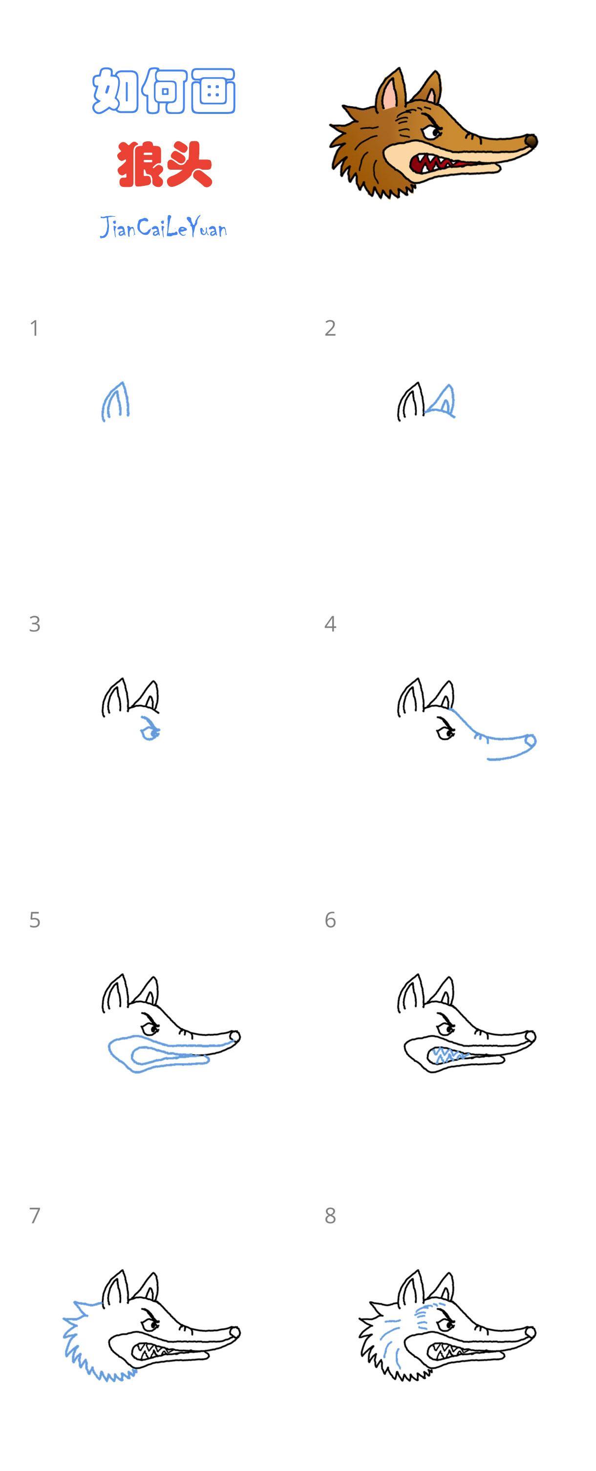 狼,外形似家犬,是猎食动物。两耳尖而直立,吻部较长,鼻端突出,有一口锋利的牙齿。那么如何用简单的笔画把狼头画出来呢?按照下面这个简单的狼头分步绘图教程,来画出自己的作品吧!