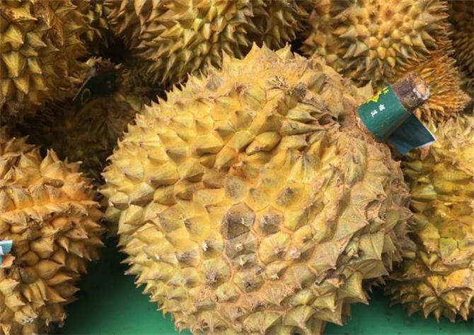 接下来,看颜色。成熟的榴莲通常呈黄色或绿色。如果榴莲呈暗黄色或黑色,可能是过熟或腐烂的,不建议购买。