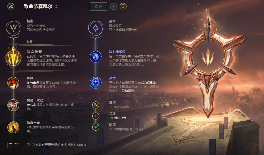 符文推荐:精密系的致命节奏和强攻都是不错的选择,甚至可以点出迅捷步伐来保证前期的发育,但是致命节奏和迅捷步伐在前期太过于弱势了,其实天使在前期的buff加成也是相当不错,一级时通过叠满层数就可以达到30攻速加成,配合E技能的已损失生命值斩杀效果,再带个点燃是可以考虑对线期就造成击杀的!