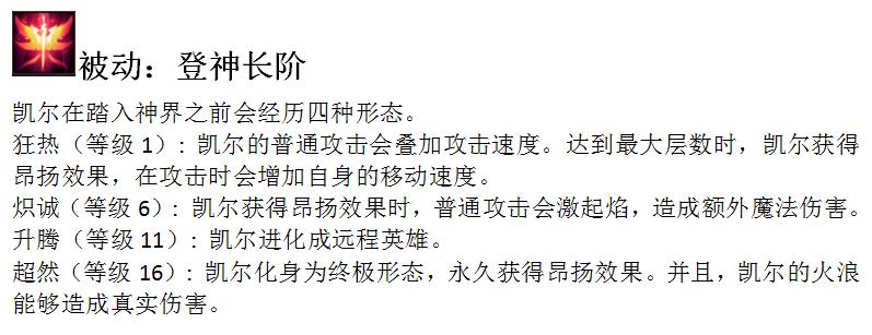 一共分为四个阶段,1级、6级、11级和16级,每当天使达到可进阶等级时都会进行一次进化,而1级和6级的效果其实都是较为鸡肋,每次普通攻击时增加攻速,并且附加一个朝着敌人移动时增加15%移动速度的效果,而在11级之前,天使都是一个近战型英雄,并且技能也没有持续输出,所以这也是为什么这么多玩家觉得天使前期过分弱势的原因,感觉天使谁也打不过!而到了11级时,天使就可以进化为远程英雄,这个时间短在游戏里其实也就大概15分钟左右,如果特别劣势估计也就18分钟以内,所以这段期间是天使的过度期,能不崩盘的或者到达13-15分钟,天使将迎来一个蜕变!到达16级就更加变态了,这也是天使能在后期接管比赛的原因,16级的最终进化会让天使永久附带满层的【焰浪】效果,并且所有的E技能被动造成的伤害转化为真实伤害,可以想象一下天使后期的E技能每次攻击大概200左右面板伤害加成,而攻击时转化为真实伤害再配合上2.0的高额攻速,在团战里的作用可以说是无人匹敌!