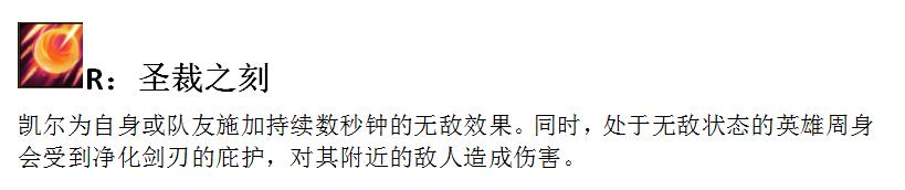 R技能 圣裁之剑:天使的大招依旧是使友方一名单位无敌数秒,但是重做后的大招更像动漫里的光剑漫落,还附带高额的魔法伤害,这让想要突进己方后排秒掉c位的刺客英雄也要三思了。但是改动后的大招有个明显的缺点,当天使给自己释放大招时,并不能进行任何的普通攻击,这样靠平a吃饭的天使在释放大招时只能殊死一搏,没有任何反打的机会。