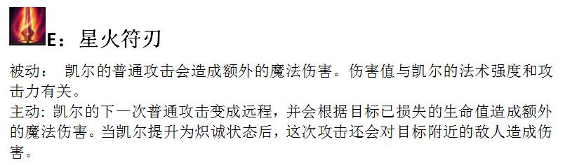 E技能 星火符刃:天使在线上必须点满的天赋,虽然在前期天使伤害不足,但也可以通过QE来不断消耗对手或者是补兵来发育自己。6级前这个技能只是一个单体伤害技能,在你达到6级进行第一次进化之后,E技能将变为超大AOE范围伤害!在这里也是提醒一下大家,天使的E技能是可以重置普通攻击的哦,类似于武器的W和蕾欧娜的Q!