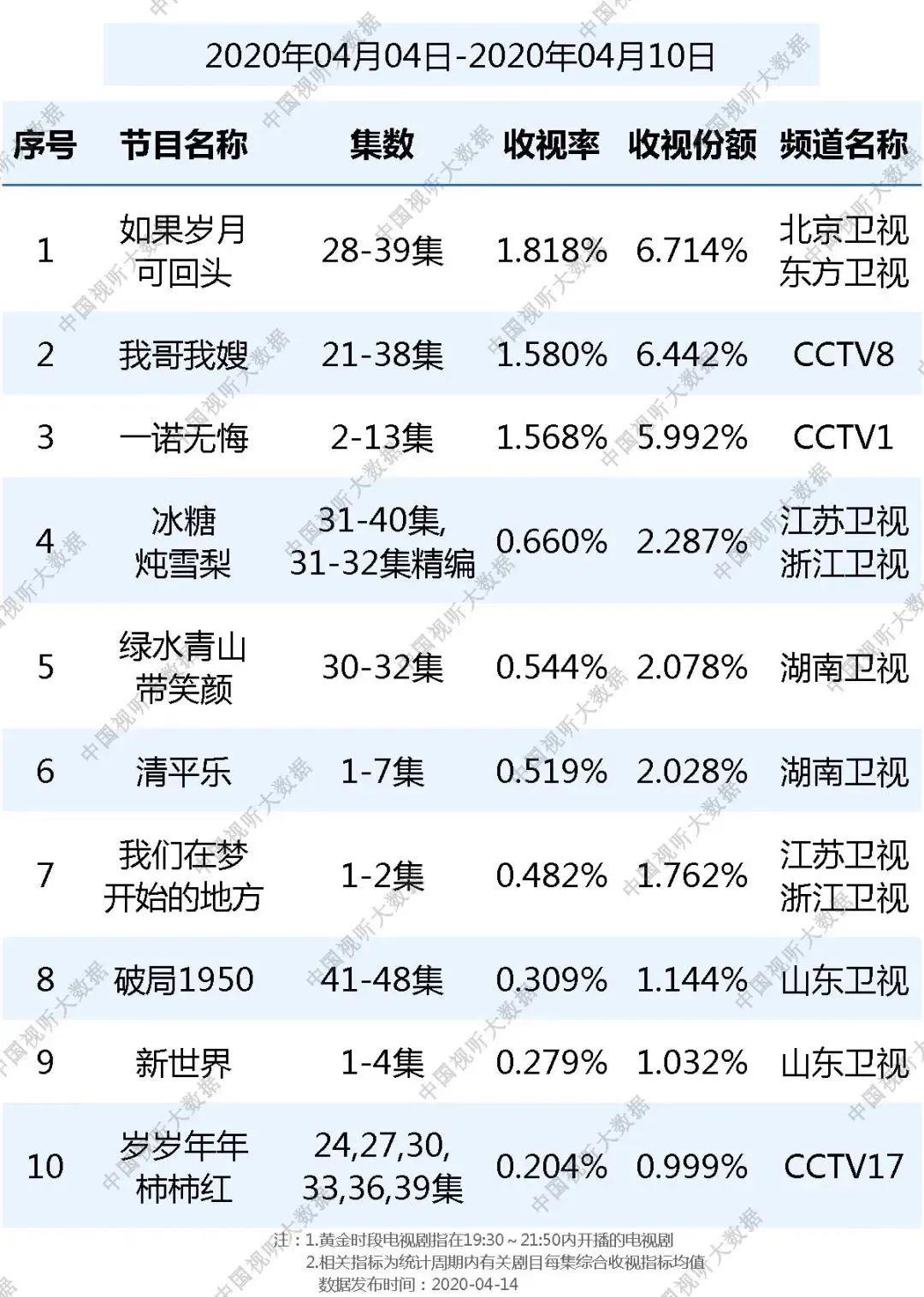 中国视听大数据发布4月4日-10日的收视成绩。《如果岁月可回头》双台收视率1.818,在央卫视黄金剧中位列榜首;CCTV-8和CCTV-1播出的《我哥我嫂》和《一诺无悔》分别超1.5。这三部剧集在该评价体系中破1。
