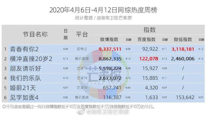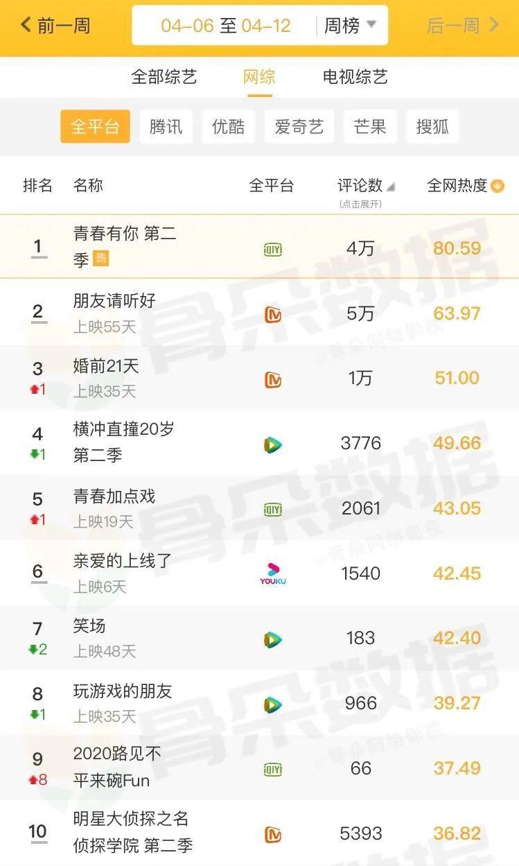 《青春有你2》近几周以来热度稳定,评论数量基本在4万上下,坐稳热度最高在播网综宝座。《朋友请听好》评论量高企,多位人气嘉宾的加盟的确带来了关注,芒果TV的高忠诚度用户在站内进行充分讨论。《婚前21天》热度较前一周上升一位,超越《横冲直撞20岁2》