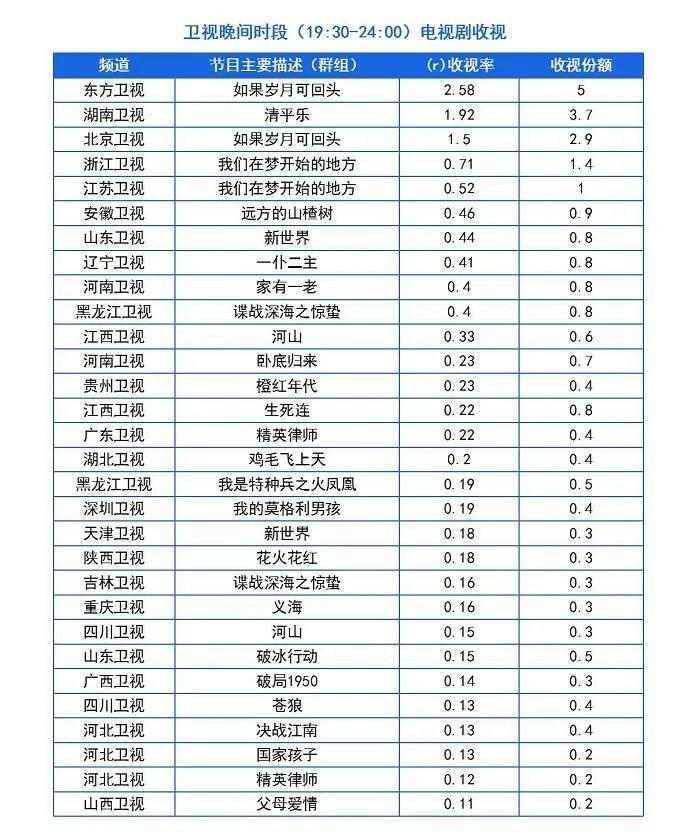 尼尔森网联海量融源收视率(全国网)显示,东方卫视《如果岁月可回头》2.5+,《清平乐》1.9+,北京卫视《如果岁月可回头》收视率1.5。《我们在梦开始的地方》没能破1。