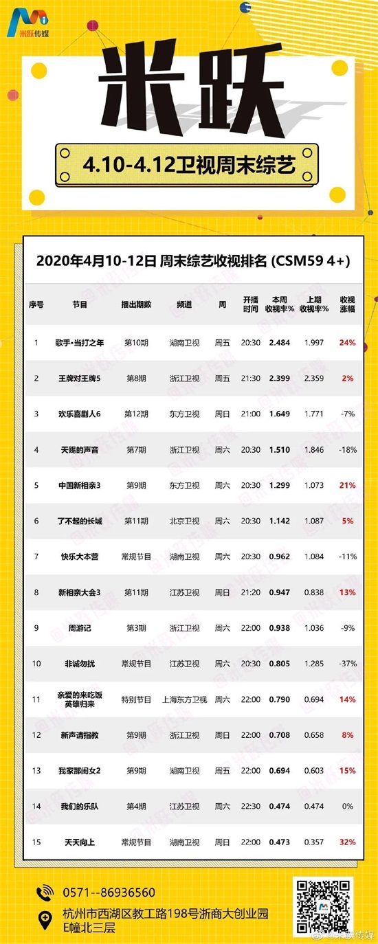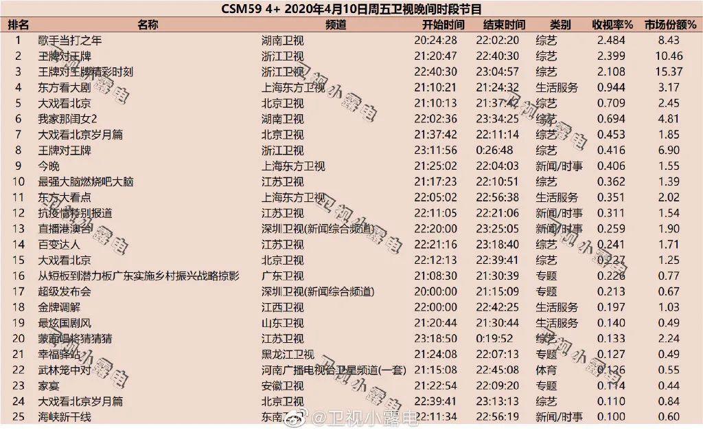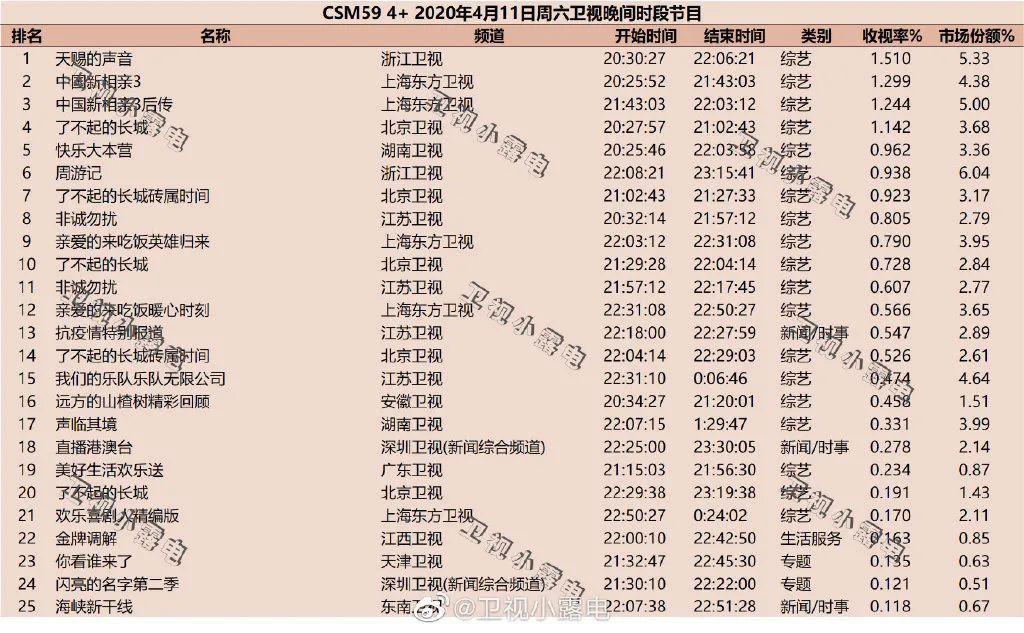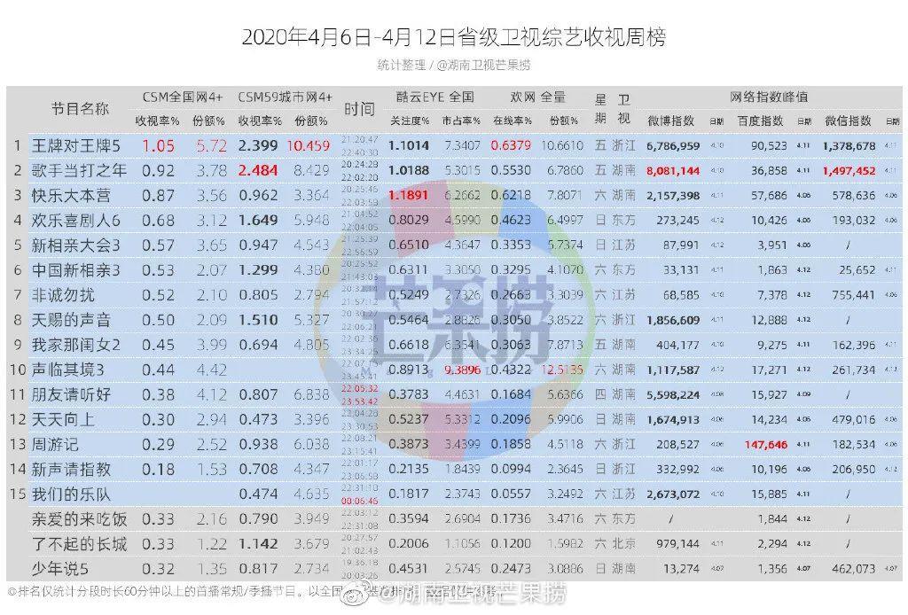 《快乐大本营》《非诚勿扰》两档常规节目未破1,前者成绩稍高为0.9+,后者则在0.8档位。《周游记》回归周六晚间档,收视率下滑同样未能破1,0.938的战力基本在线。《亲爱的来吃饭》连续策划多期疫情主题节目,本期以“英雄归来”为主题的节目收视率近0.8。《我们的乐队》与上期收视率丝毫未差,仍为0.474。《声临其境3》上周收官,但收视率统计上出现问题,参考价值不强。