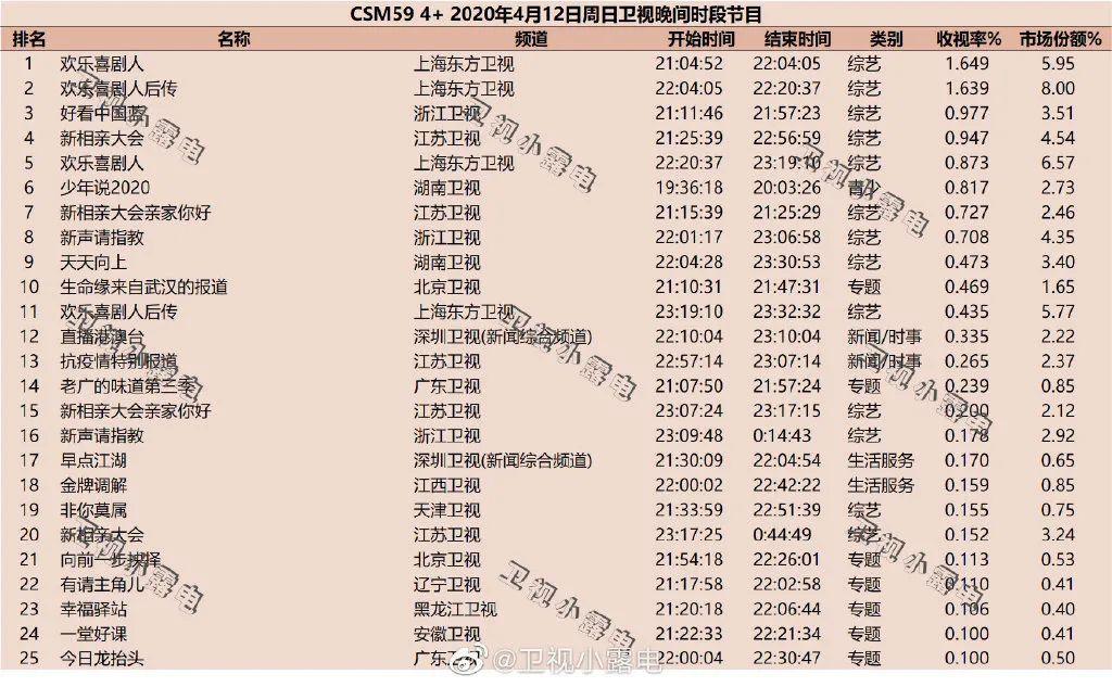 周日晚,《欢乐喜剧人6》赛程进入后半段,收视成绩1.649居于全周第三,与其巅峰状态有一定差距。《新相亲大会3》在婚恋类节目中处于中上水准,上周收视率近1。730时段节目《少年说2020》成绩稳定,超过不少周末季播综艺。《新声请指教》比前几周进步明显,成绩已达0.7+。《天天向上》收视率增长不少,但绝对值仍有继续上升空间。