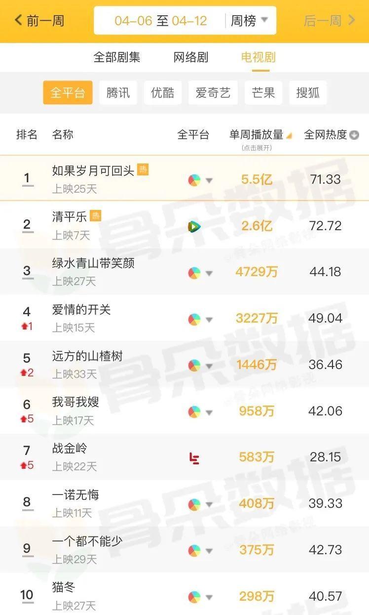 网播方面,《如果岁月可回头》周播量5.5亿,在一众电视剧中播放量最高;《清平乐》周播量2.6亿;其他剧集播放量均未破亿。《清平乐》开播后一举拿下微博、百度指数冠军,其微信指数也很可观;《冰糖炖雪梨》则将微信指数第一名收入囊中。