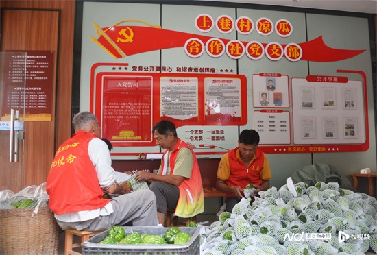上巷村是国家地理标志产品杜阮凉瓜的核心产区。近年来,上巷村大力发展凉瓜产业,不仅成立了凉瓜专业合作社和凉瓜产业服务有限公司,还组建起合作社党支部,通过党员农户带头先学新技术、先试新品种、先承担风险、先开拓市场,合作社统一代销、统一收货、统一结算、统一挑选,村里凉瓜种植规模由原来的零散种植扩大到80亩,年产量提高到10万斤。