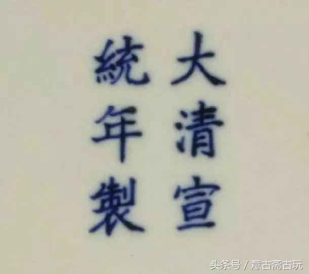 宣统官窑青花瓷只有“大清宣统年制”六字双行楷书款一种。青料色泽明快、鲜亮,不晕散。字外无圈框,字体似光绪款,笔法遒劲,字体秀丽,具有很高的书法价值。