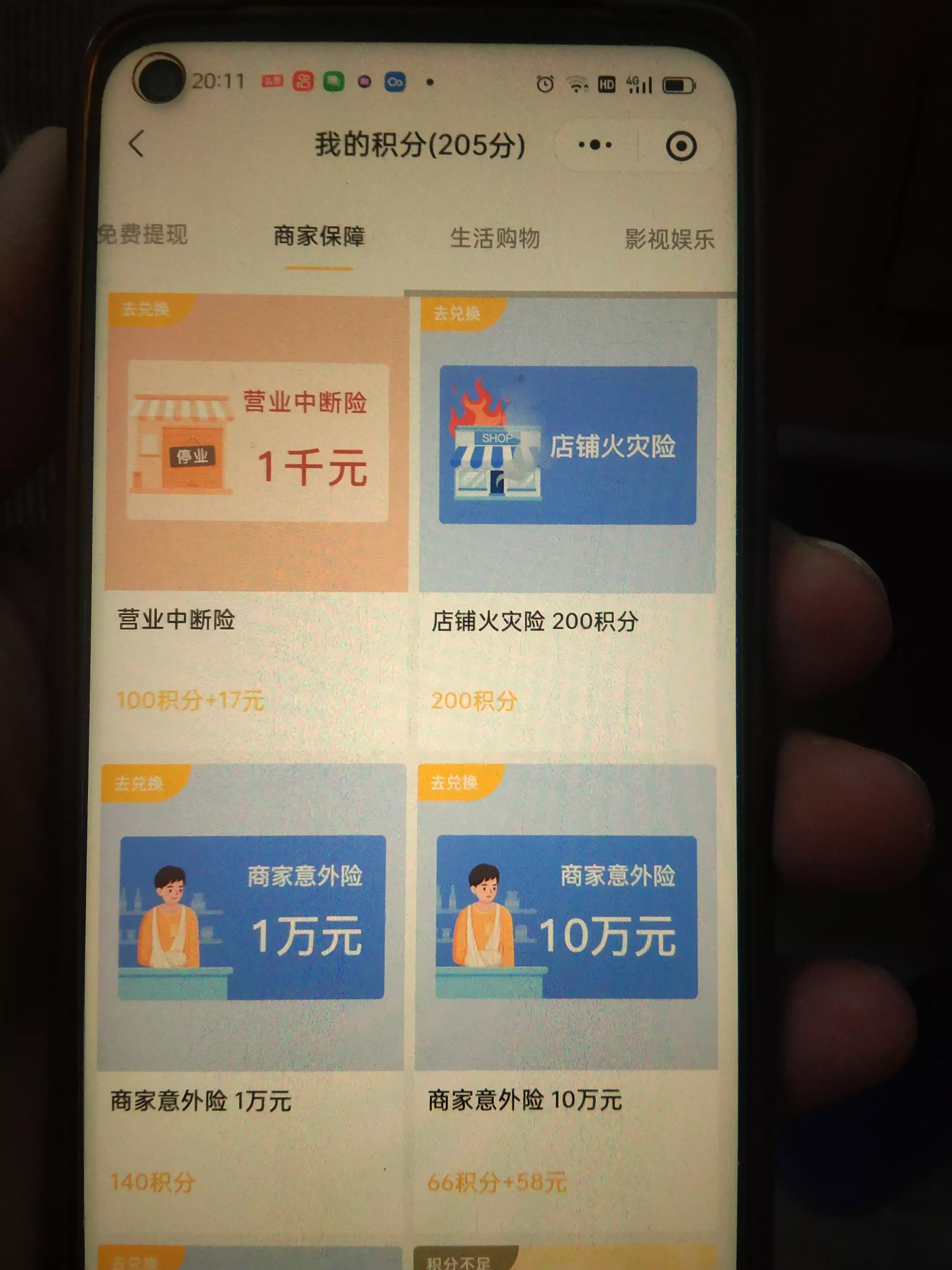 除了可以兑换提现券以外,还有一些商家保障也是值得我们了解的,比如这个营业中断险,二维码防掉保险,以及还有其他的更多保险,我们都可以用积分去兑换,并且不需要太多积分,比如店铺火灾险,只需200积分就能够去兑换,(如上图所示)