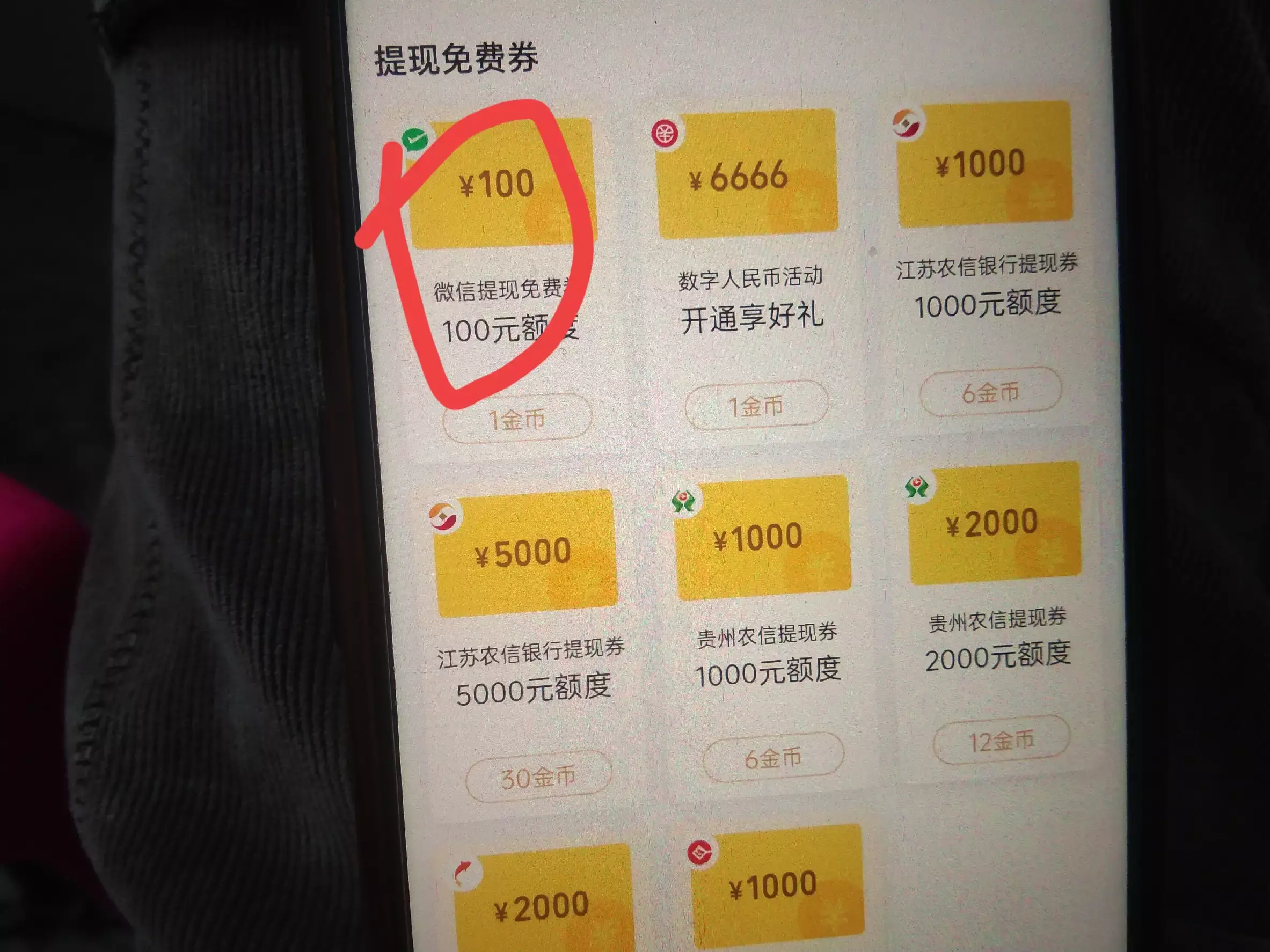 在这里就有很多的额度供我们选择,我们选择适合自己使用的提现券进行兑换,比如我想用一个金币兑换100元的额度,点击它,(如上图所示)