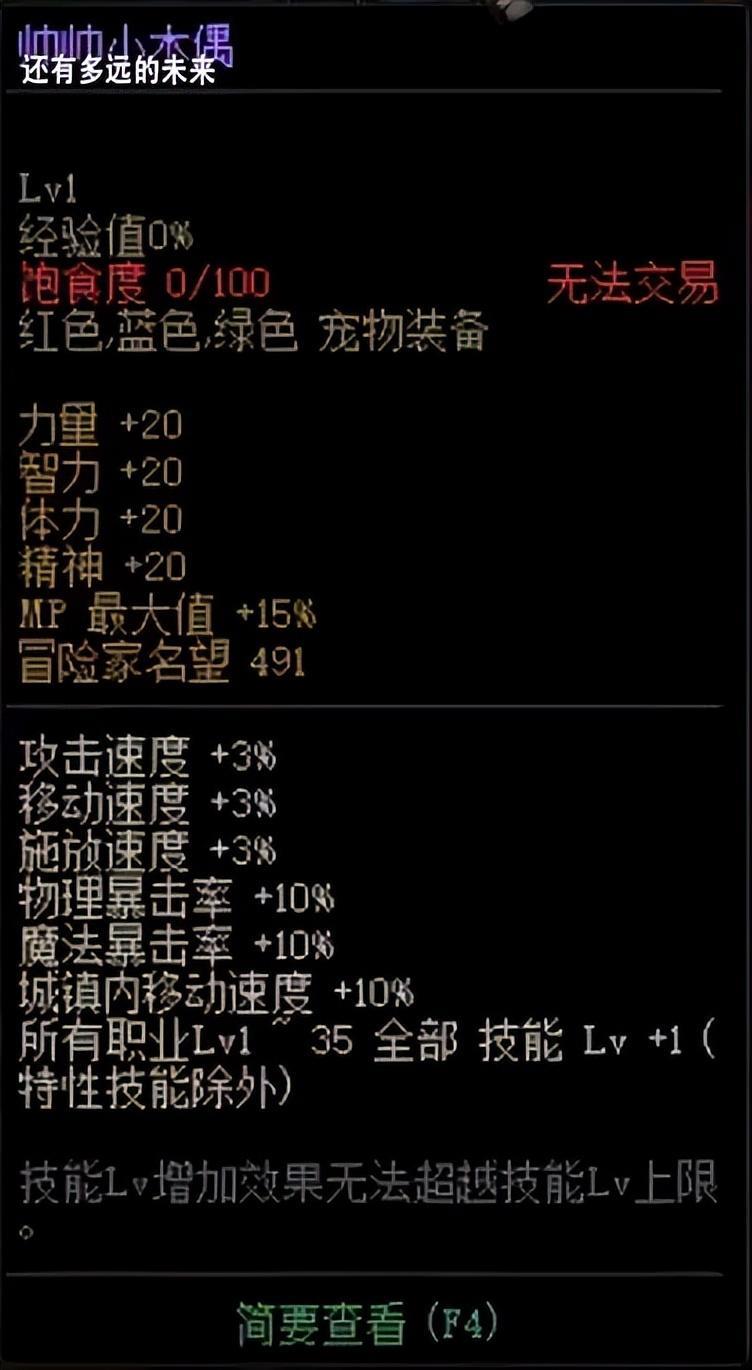 属性为:力量+8智力+8体力+8精神+8HP最大值+100物品栏负重上限+5kg城镇内移动速度+5%