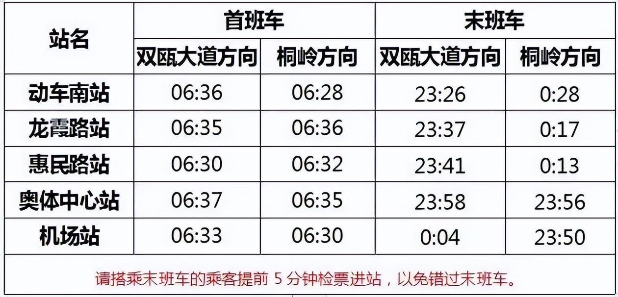 动车南站、机场站两大交通枢纽站及奥体中心站、龙霞路站、惠民路站三个客流重点站发车首末班时间如下表:
