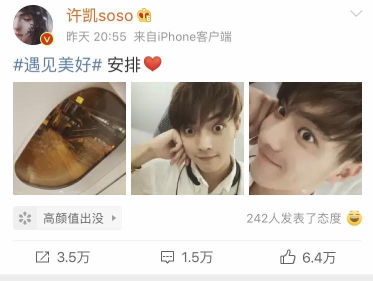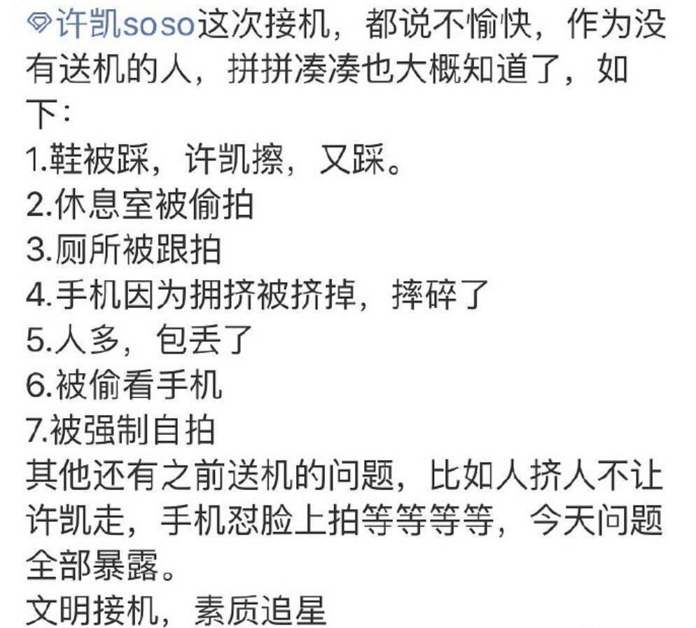 有网友爆料,许凯的接机粉丝把许凯手机踩碎了,而且许凯在休息室被偷拍,厕所被跟拍,因为人多,包也丢了,还被强制自拍。粉丝要理智追星啊,许凯真是好委屈一男的~
