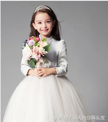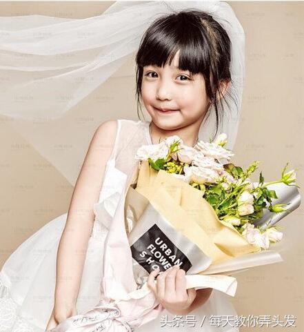 每个女孩都梦想自己拥有一身美丽的白色公主裙,这款漂亮的裙子显得女孩甜美可人。发型是最自然的盘发,刘海顺滑柔软,剪成可爱的齐刘海,双鬓的发丝稍长一点,将头发扎在脑后,戴上洁白的头纱,天真浪漫的小女孩惹人怜爱。
