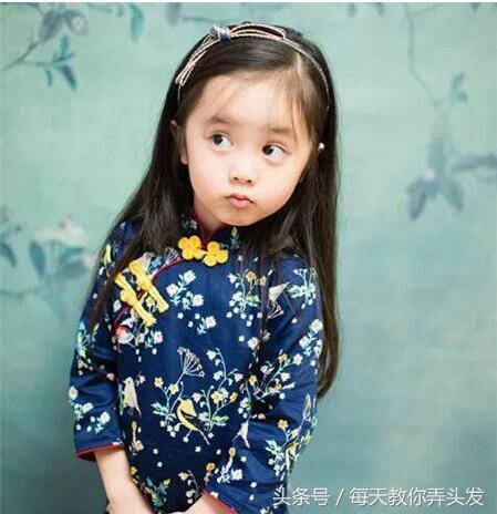 这款民国风的旗袍装扮,显得小女孩文静乖巧。这款发型就是很随意地一款披肩长发,不需要做任何的烫发处理,自然就好。刘海可以扣在耳朵后面,然后带上很时尚的小发箍,就很完美了。可如果额头有点太大的小女生,可以选择挑出几缕发丝,散落额头,起到修饰作用。