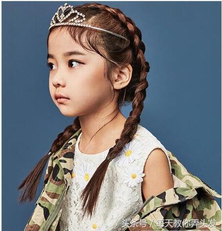 酷炫的迷彩夹克,代表着小女生的桀骜不羁的个性。整个发型是非常精致的公主编发,双马尾造型复古优雅,头顶的发箍设计,给人一种细节美感。小公主的标配一定是一款金光闪闪的皇冠,搭配白色公主裙,就是一个酷酷的小公主!