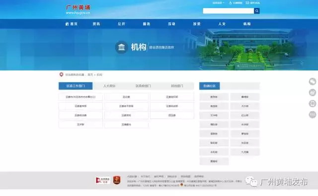 这是集约化建设的重要板块,这个板块为黄埔区的各个部门、街镇设立了专属网页。从这里点击相应部门和街镇入口,即可进入其网页,了解相关的信息。