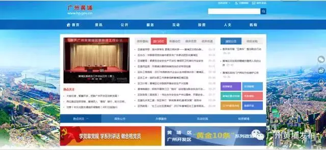 三幅形象图开幕后,网站首页主体部分升起,公众在首页通过切换热点关注、政务公开、办事服务、互动交流、投资黄埔五个页签就可以了解全站重点内容。