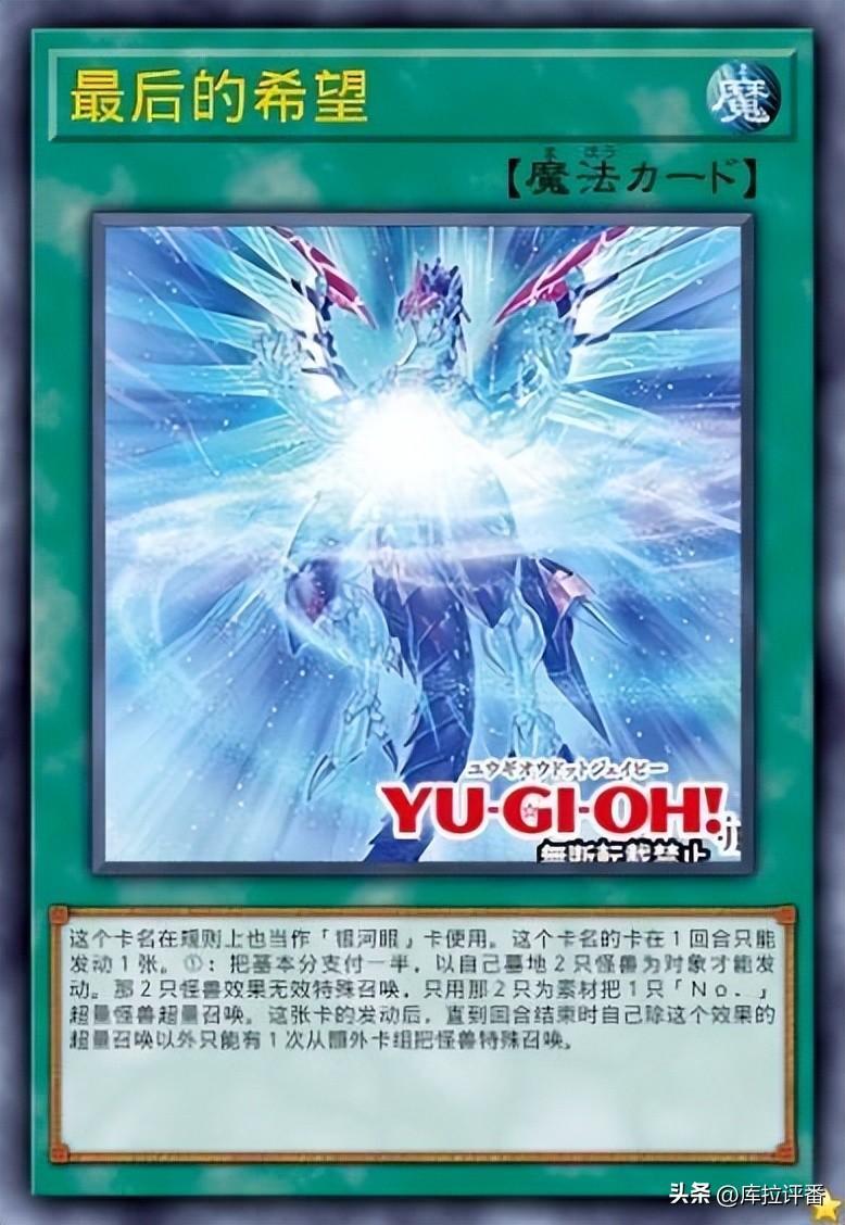 最近的新卡“最后的希望”(这个卡名规则上也当作「银河眼」卡使用。这个卡名的卡1回合只能发动1张。①:可以支付一半LP,以自己墓地的2只怪兽为对象发动。将那2只怪兽效果无效地特殊召唤,只将那2只怪兽作为素材来超量召唤1只「No.」超量怪兽。这张卡发动后,直到回合结束时自己在用这个效果所作的超量召唤以外只能从额外卡组特殊召唤1次怪兽)目前看来只适合银河眼(实际为多字段卡,还有编号系的字段,理论上来说霍普也能用),并不适合霍普(霍普检索这个,还不如检索“编号系防护”)。银河眼检索最后的希望比检索“银河零式”或“银河天翔”更舒服。“银河眼光子卿”在对方回合检索最后的希望,到下个自己回合还能快速做出“CNO.62超银河眼光子龙皇”。