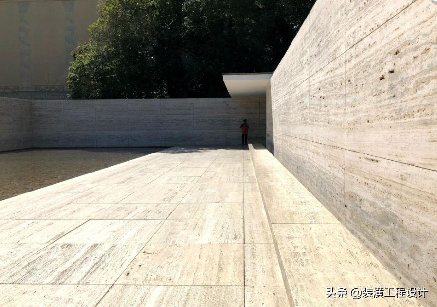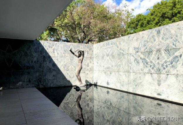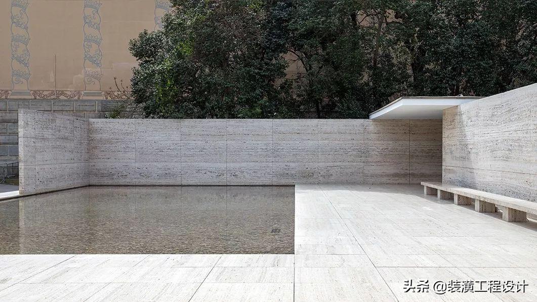 巴塞罗那国际博览会德国馆,密斯·范·德·罗的代表作品,建成于1929年,博览会结束后该馆也随之拆除,其存在时间不足半年,但其所产生的重大影响一直持续着。密斯认为,当代博览会不应再具有富丽堂皇和竞市角遂功能的设计思想,应该跨进文化领域的哲学园地,建筑本身就是展品的主体。密斯·范·德·罗在这里实现了他的技术与文化融合的理想。在密斯看来,建筑最佳的处理方法就是尽量以平淡如水的叙事口吻直接切入到建筑的本质:空间、构造、模数和形态。