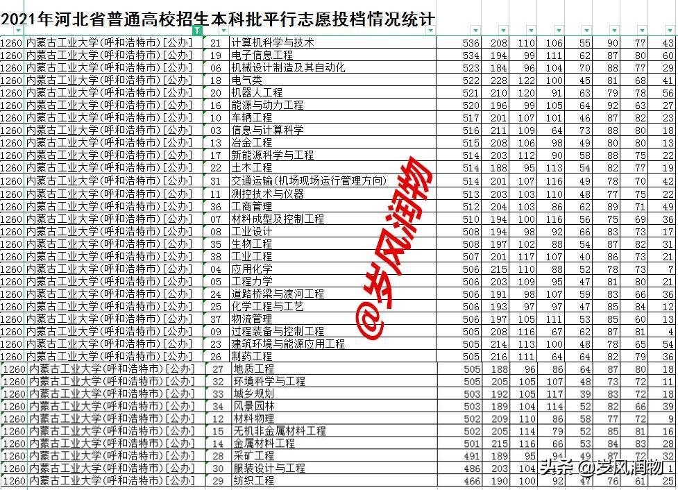 在2021年河北省高考招生物理科目组中,内蒙古工业大学提档分数最高的专业计算机科学与技术536分和电子信息工程534分,其他大部分专业提档分集中在501-523分,最低分专业服装工程仅有466分。同时,河北科技大学最高分专业计算机类达到550分,最低分专业化工与制药类也要512分,而大部分专业都在520分之上;华北理工大学除医学类外电气工程及其自动化达到545分,最低分的矿业类也要495分,而大部分专业也在520分之上;河北工程大学最高分的计算机类538分,最低分的植物生产类483分,一半左右的专业提档线在520分之上。