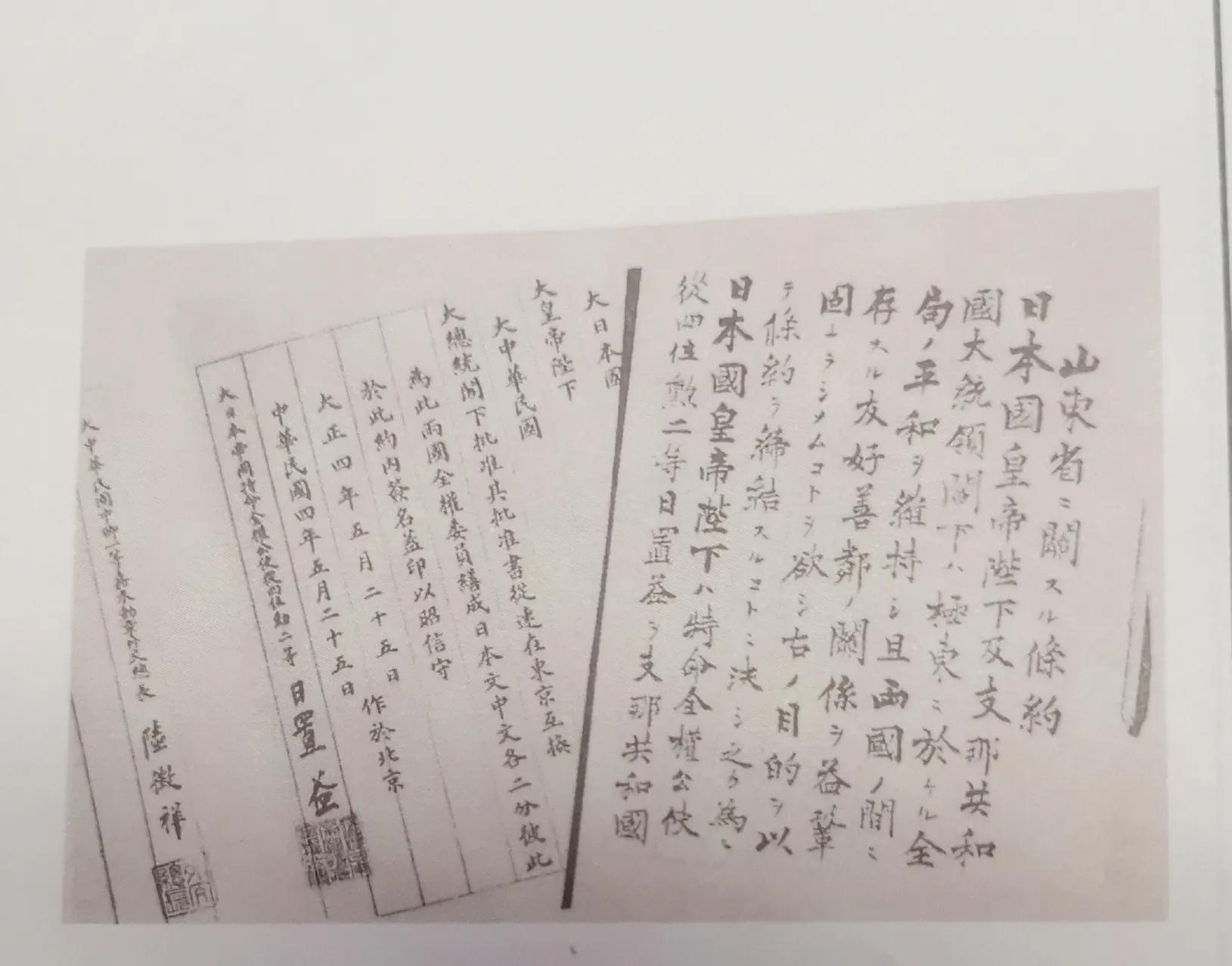 1915年5月7日,日本政府发出最后通牒,限北京政府外交部48小时内答复,否则“将执认为必要之手段”。袁世凯为了取得日本对他称帝的支持,于5月9日接受了除第5部分几条之外的全部要求。5月25日,“二十一条”的换文由袁世凯派外交总长陆徴祥与日本驻华公使日置益在北京签字。