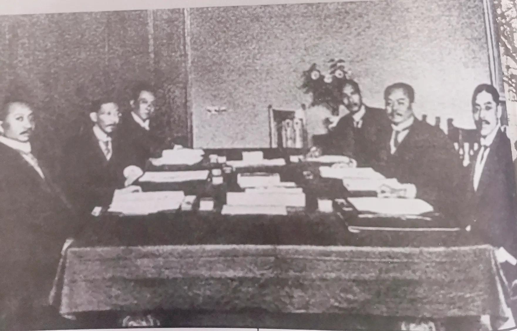 1915年5月25日,袁世凯派外交总长陆征祥、次长曹汝霖及施履本和日使签订“二十一条”密约。这是订约后合影