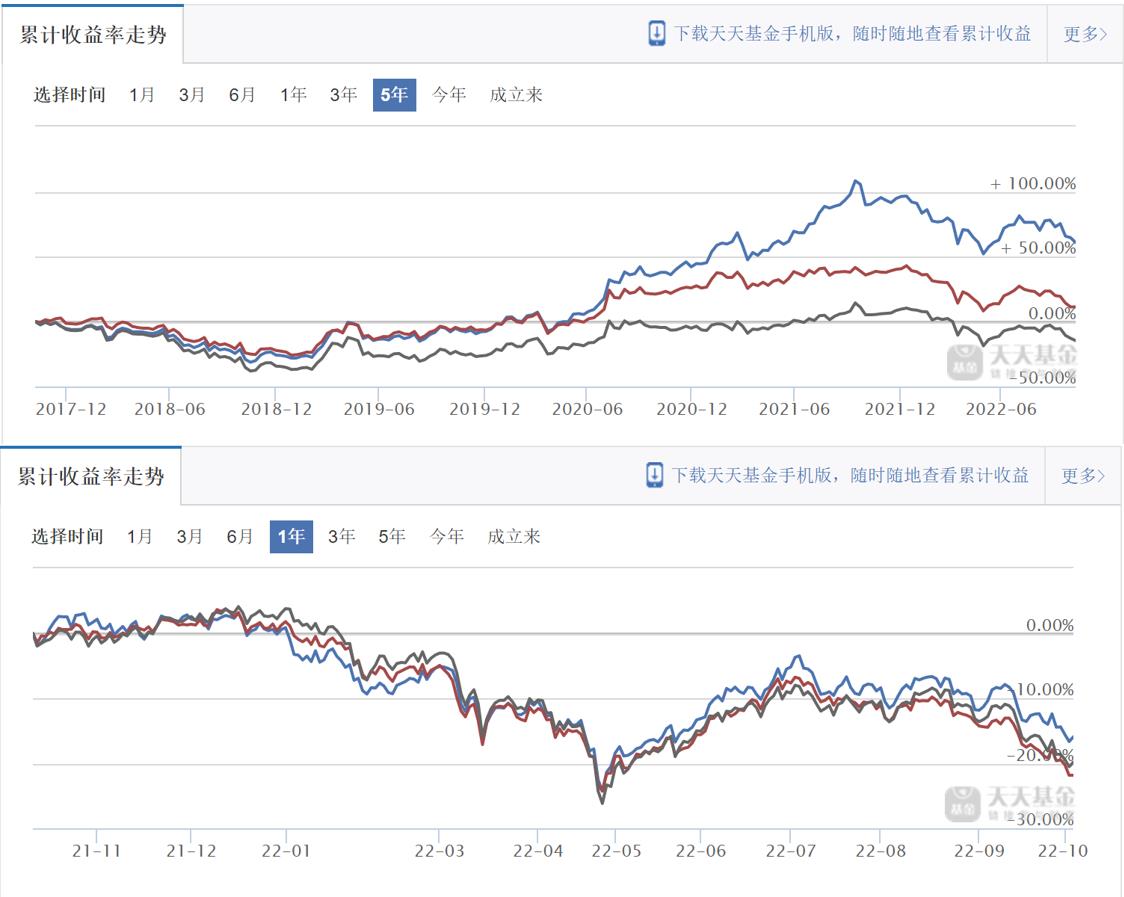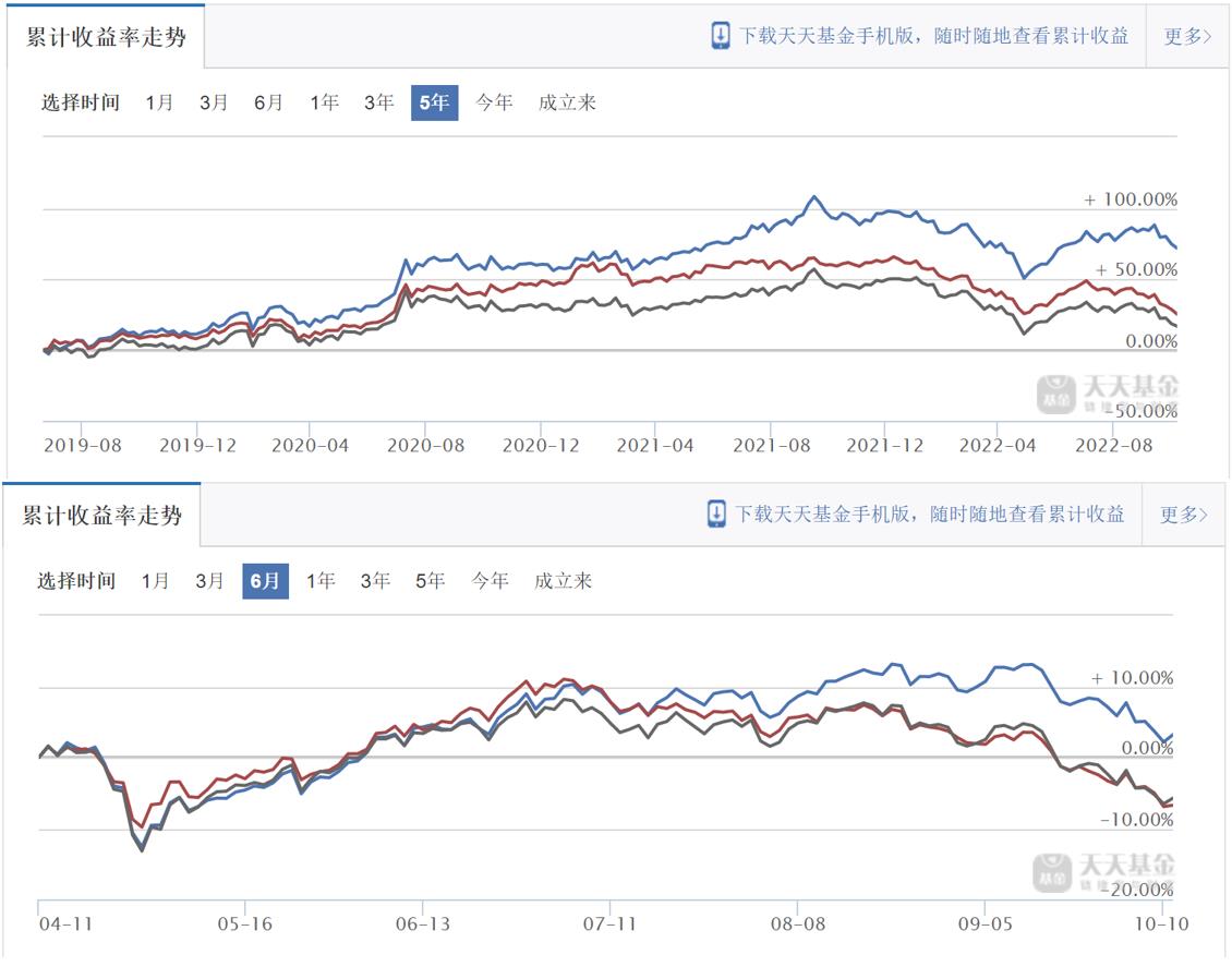 在剩下的15支里面,只能一支一支地去做对比了,首先看成立大于4年的,去掉了收益率较为靠后的,然后在把基金的对比走势拿出来做个对比,看看波动率情况了。然后发现成立不到2年的资金曲线图确实看不太出来情况,所以只能把不到2年的都去掉了。