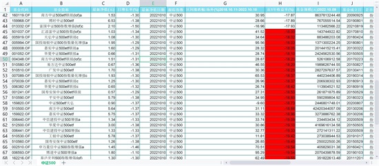 这里,笨鸟开始做一些减法,首先中证500指数近1年的涨幅为-20.52%左右,加上指数的股息率2.15%,理论上来说收益率应该是-18.38%才对,所以在这里把近1年跌幅超过18%的基金就去除了,这样就只剩下了53支基金。