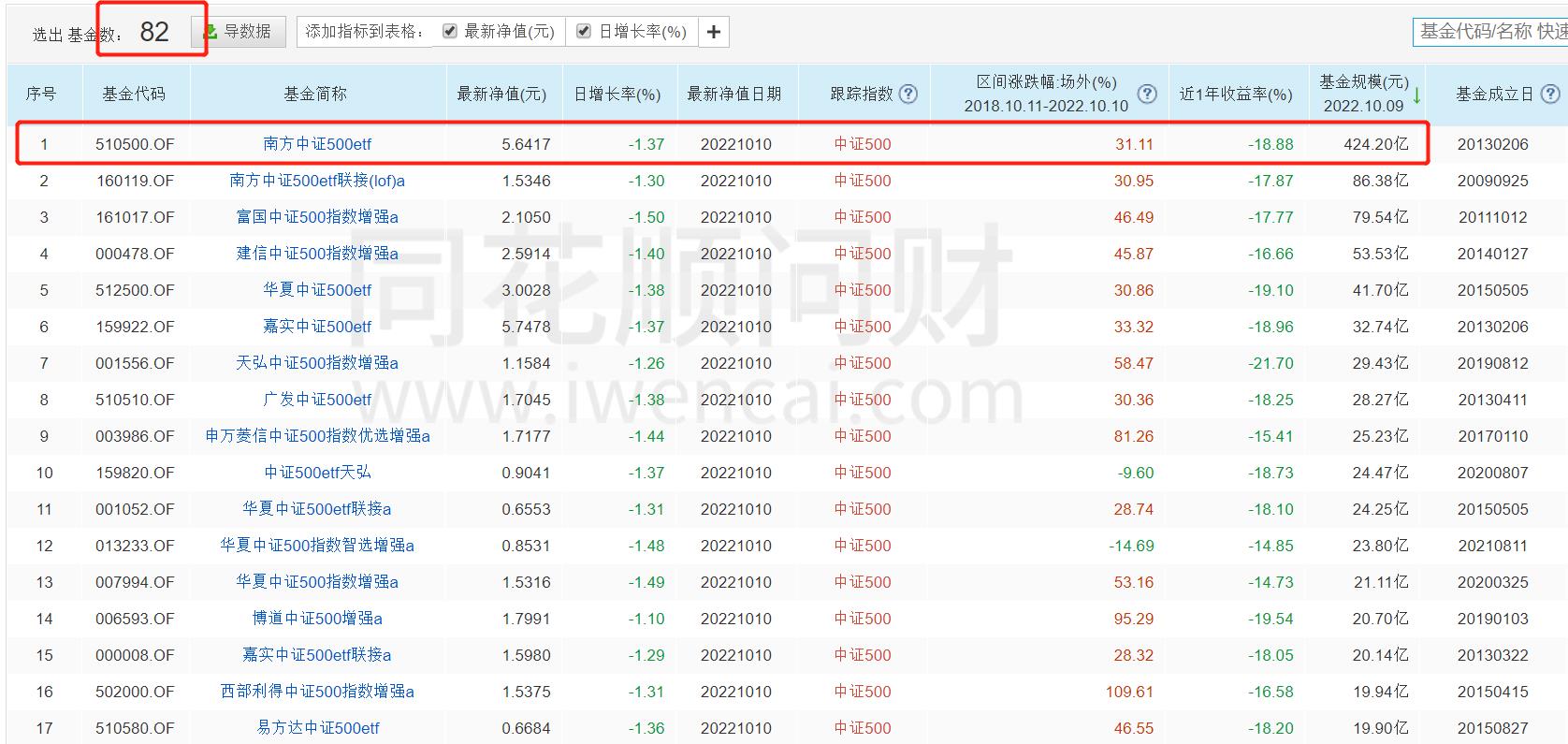 按照近4年收益率和近1年的收益率,以及规模大于1亿,成立时间大于1年的条件,笨鸟选出了82支追踪中证500指数的基金,可以看到规模最大的就是中证500ETF(SH:510500),规模之大,甚至比规模排名2-10这9支基金规模的总和还多20多亿!