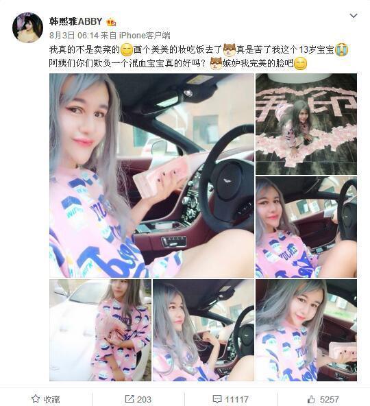早前自称16岁以及八国混血美少女的韩熙雅一直在微博上模仿被网友骂成一片的刘梓晨,无论是直播还是照片都把自己P成蛇精脸,并且为了凸显自己身材,大臀大胸的Ps图也比比皆是。不仅如此,微博上的韩熙雅炫富与抨击当红小鲜肉一个不落,与 蛇精男 刘梓晨的套路异曲同工。此次事件一出,网友们也是纷纷吐槽: 特么一个刘梓晨出来了,个个出来赚钱辣眼睛! 这种脸应该是p出来的吧,我不相信有人会整成这样,告诉我,我不是一个人! 大家不要在骂她了,善良的我希望有人能站出来打死她。