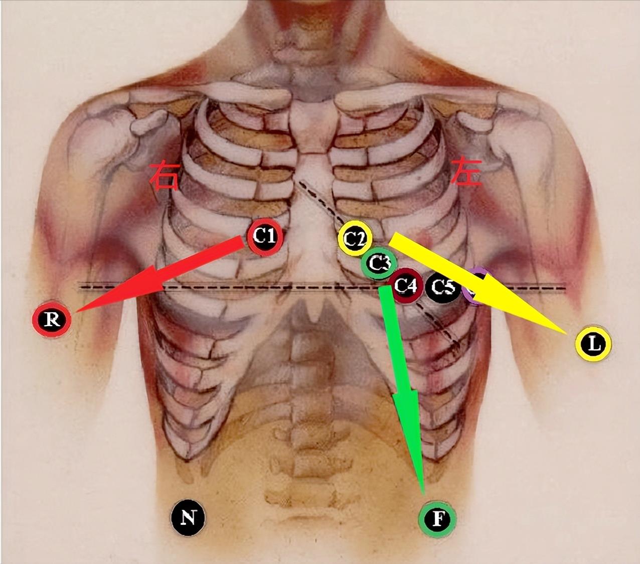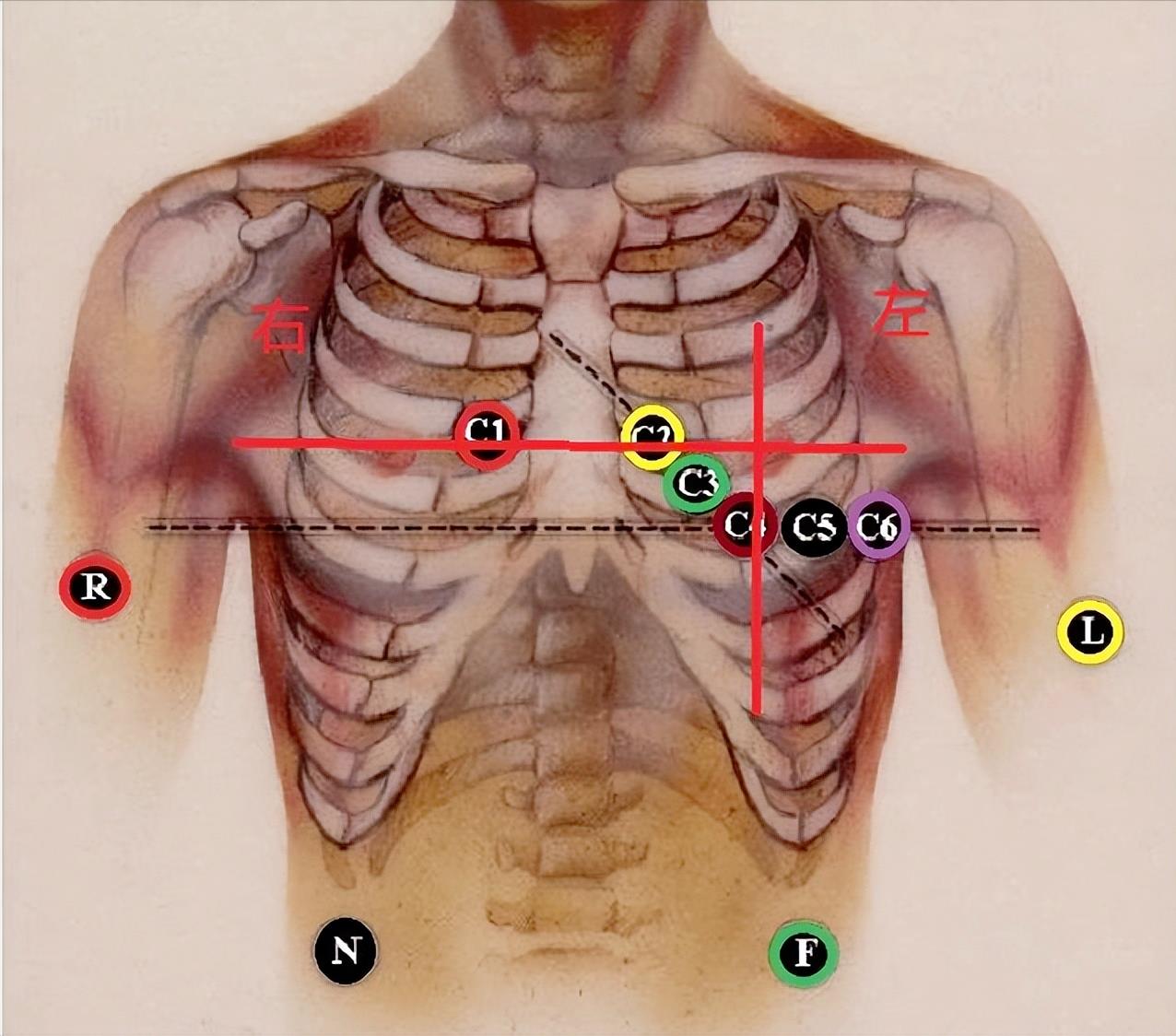 以成年男性为例,连着两乳头画一条横线,这条横线的位置,刚好就是第四肋间,这样C1刚好就在这条直线上的胸骨右缘,C2刚好就在这条直线上的胸骨左缘。再沿着左侧乳头画一条垂直的竖线,这条竖线的位置,刚好就是左锁骨中线,乳头在第四肋间,乳头下方约3横指左右的位置为第五肋间,C4就在这个位置。C1、C2、C4定完位置之后,C3就在C2和C4连线的中点、C5、C6和C4平行分别在腋前线、腋中线的位置。