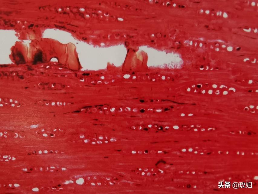 单管孔为主,导管分子单穿孔,管间纹孔式互列。轴向薄壁组织主为星散,聚合,断续带状及翼状。木射线微叠生。单列射线,高多为4~8个细饱,多列射线宽2或3个细胞,高4~14个纽胞,连接射线可见,射线组织同形。