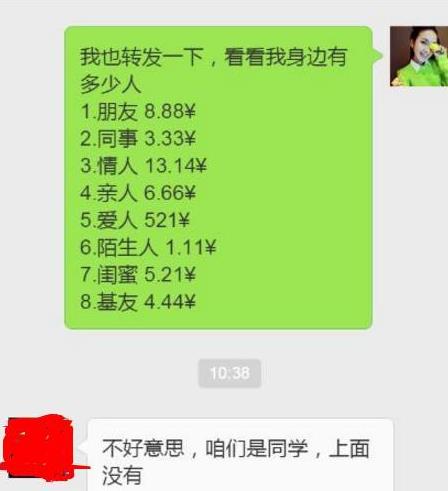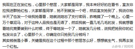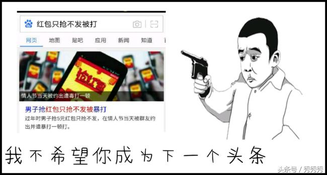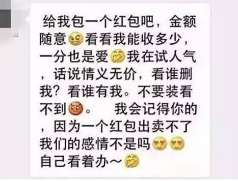 生活中坑爹坑娘的、开个小玩笑方式要红包的还情有可原,但是没钱打车要红包、没钱吃饭发10块钱红包、买水要红包,甚至打胎都要你发红包,各种奇葩理由要红包的,这种人不是贪小便宜的就是爸妈生他的时候脑子夹了子宫门的,特别是以色相诱人的,各位网友要擦亮眼镜,睁大眼睛看清看楚了,掉下了陷阱钱失了事小,就怕一股脑暴露了各种隐私还有你的智商。