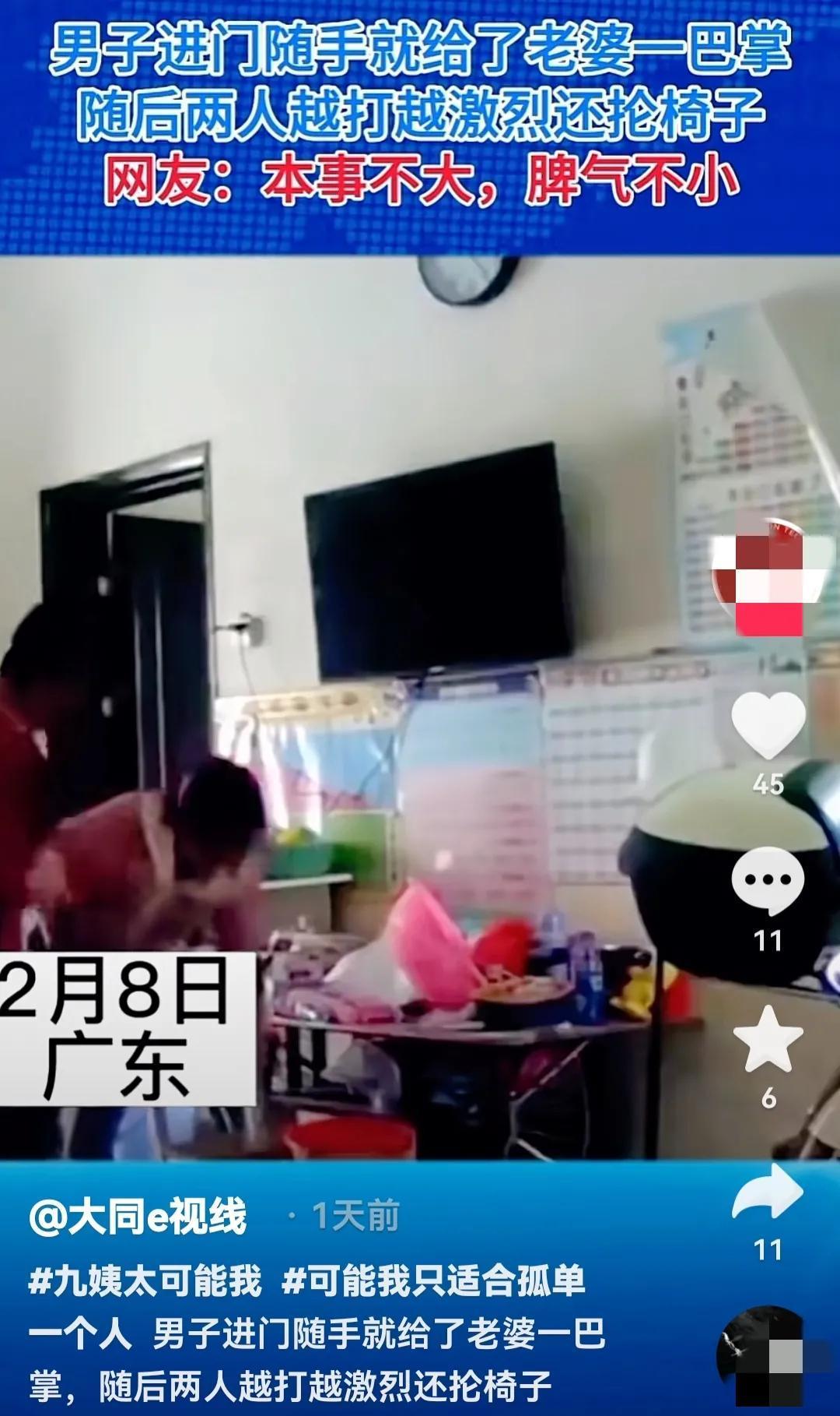 从以上视频图片可以看出,该夫妻关系非常紧张,丈夫进门不由分说的就给了妻子一记耳光,妻子也不含糊,直接起身反击。管中窥豹,平常两夫妻日常生活状况可见一斑,肯定是鸡飞狗跳,家中鸡犬不宁。