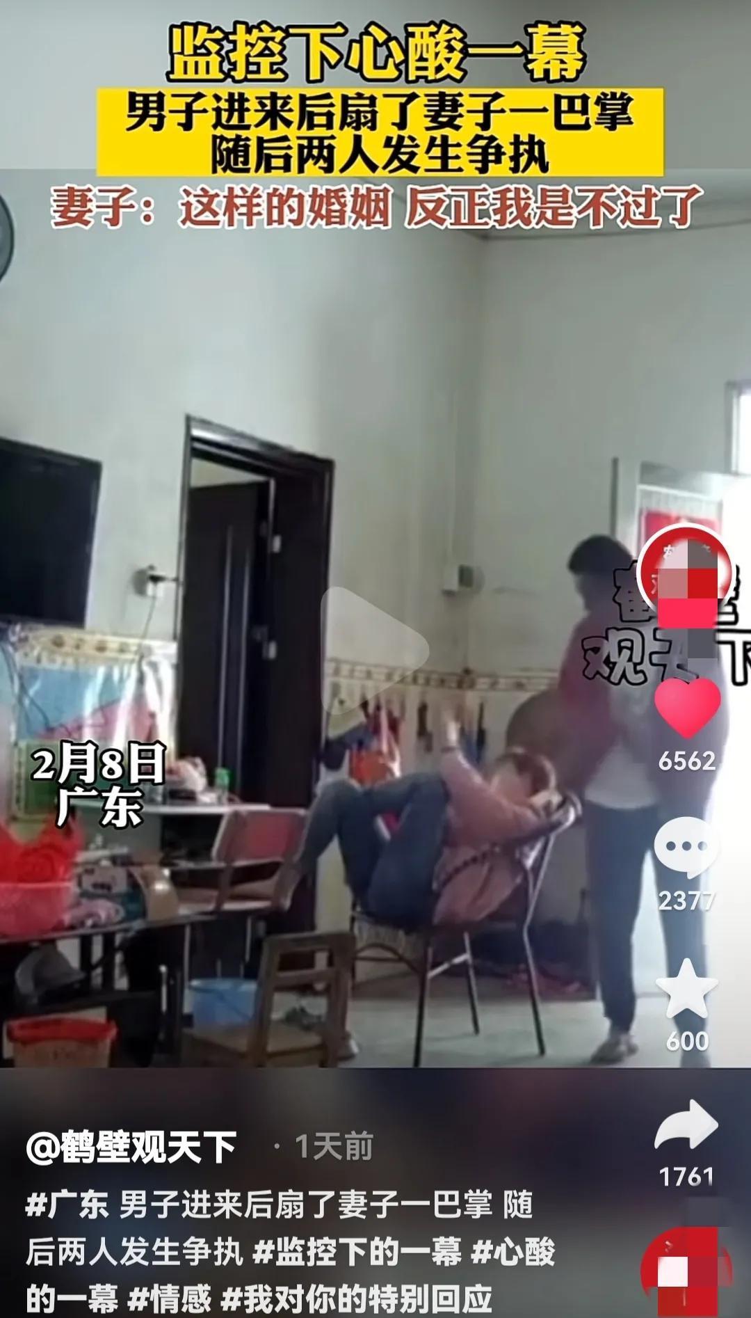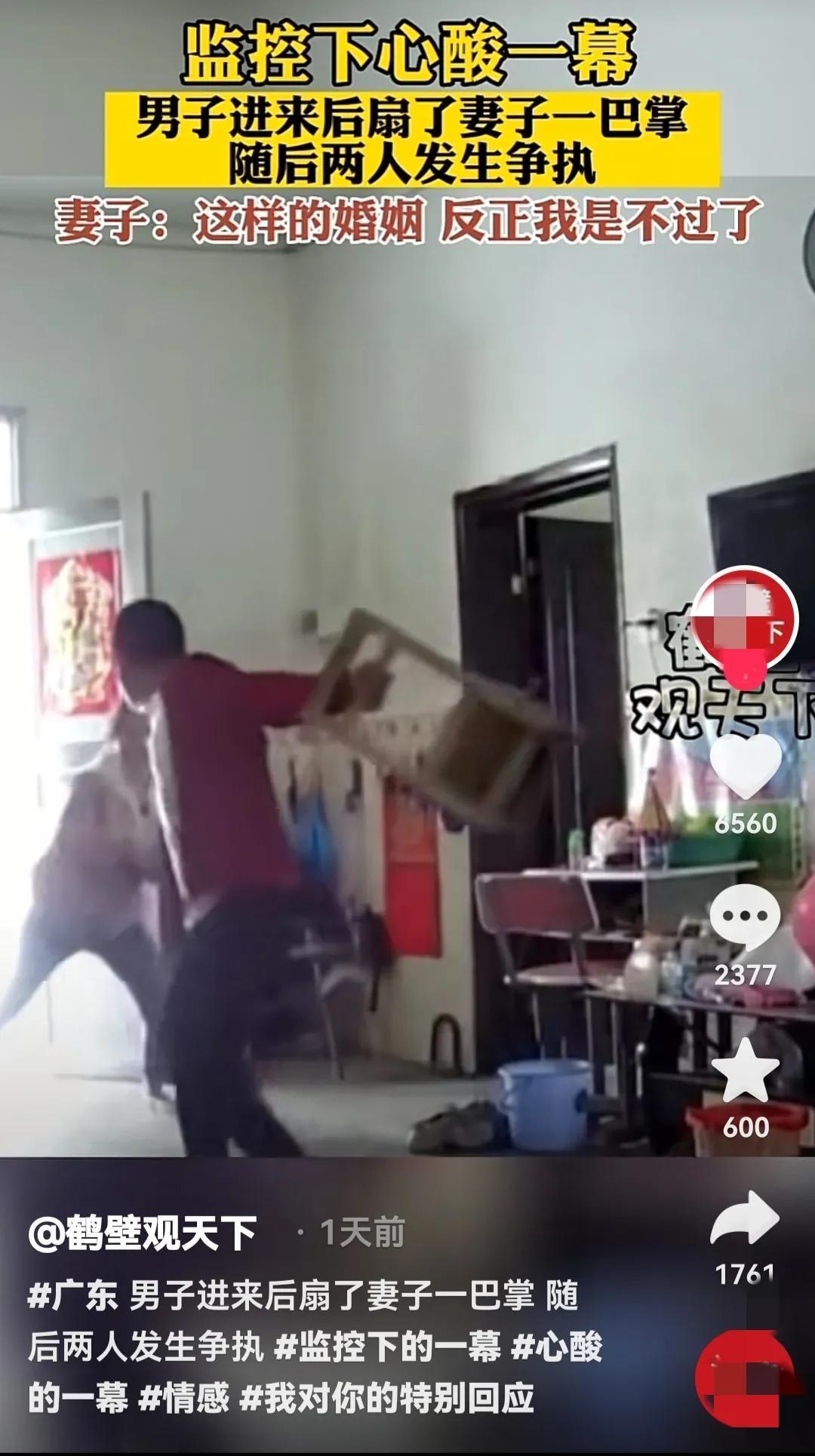 广东一丈夫无故打妻子耳光,妻子反抗被丈夫击打,妻子大哭逃跑