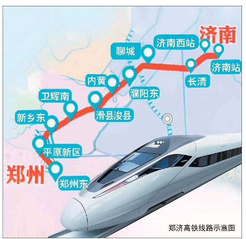 今年的济南市政府工作报告指出,加快济南“米”字形高铁网建设,启动济郑、济滨、济莱等高速铁路建设。据悉,2016年11月初,备受关注的郑济高铁河南境内的濮阳段和新乡段已开建。济郑高铁郑州至濮阳段新建线路长196.871公里,设计速度为350公里/小时,总投资380.02亿元。全线共设郑州东、平原新区、新乡东、卫辉南、滑县浚县、内黄、濮阳东等7座车站。
