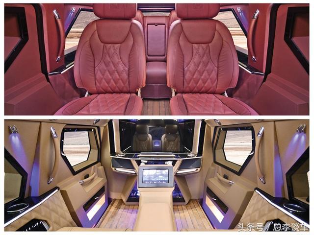 乔治巴顿有4座和6座,车窗玻璃是钢化玻璃,并非防弹玻璃,不管是4座还是6座都只有一个备胎,四座的有小吧台和多功能餐桌,车顶都是高级鹿皮,说白了就是普通SUV,只是豪华一点而已!